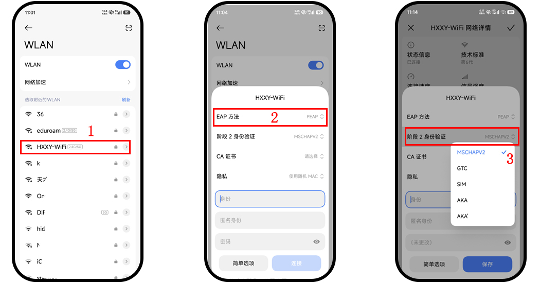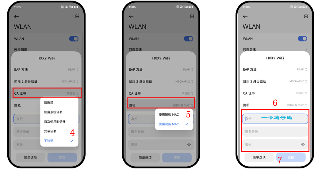 安卓移动设备用户,可以打开无线网络,1、选择SSID为“HXXY-WiFi”的无线网络,2、EAP方法选择PEAP,3、阶段2身份验证选择MSCHAPV2(优先选择),部分手机无MSCHAPV2选项,可选择不验证/无,4、CA证书选择不验证(优先选择)/无,5、隐私选择“使用设备MAC”(部分手机需要在高级选项中寻找此选项), 6、身份/用户名栏输入一卡通账号,匿名身份不填写,密码栏输入上网密码,7、点击连接按钮进行连接。