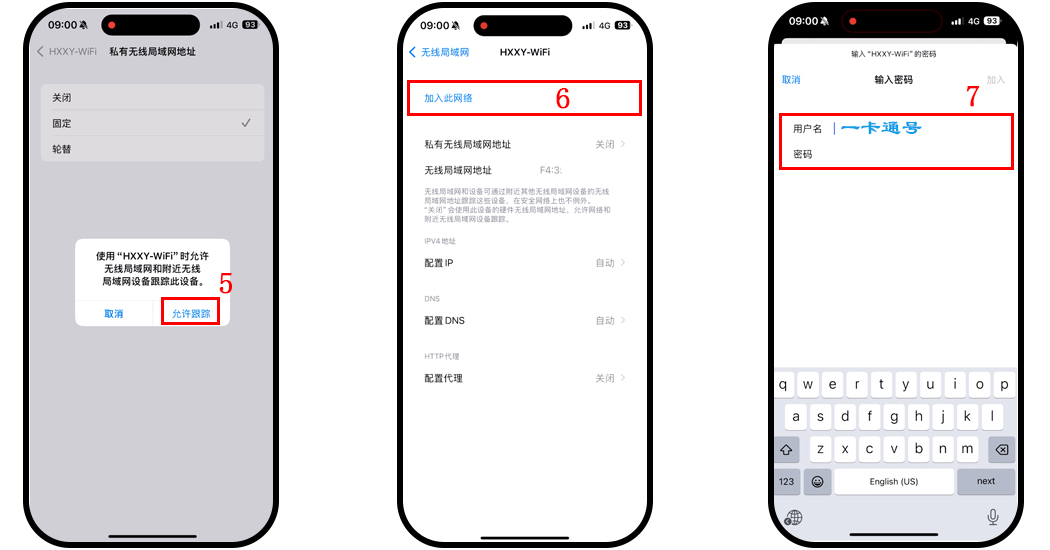 4、选择“关闭”选项,5、点击“允许跟踪”,6、返回上级菜单后,点击“加入此网络”,7、用户名栏输入一卡通账号,密码栏输入上网密码,点击加入按钮进行无线连接。如果弹出信任证书的页面,选择信任该证书即可。