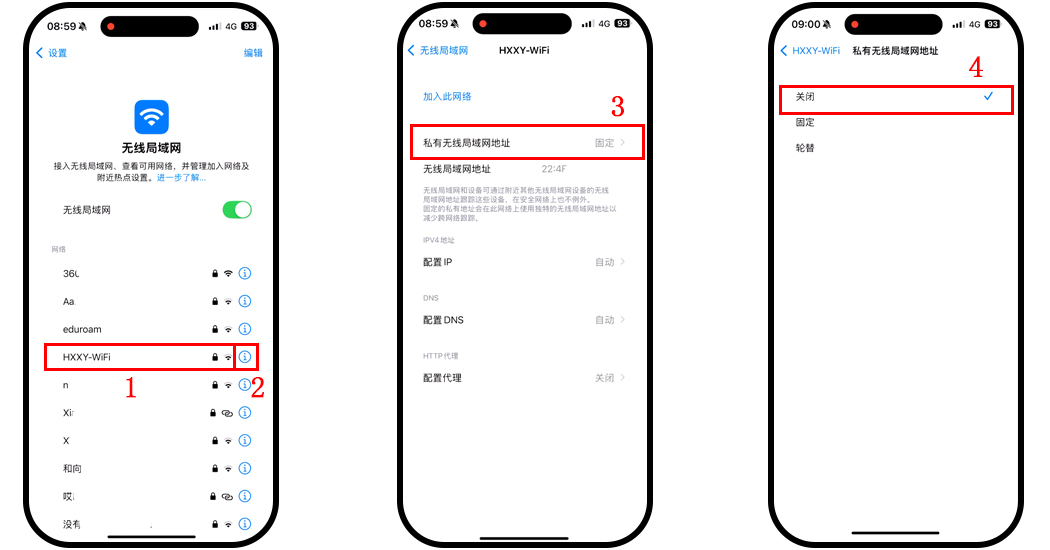 苹果移动设备用户,可以在设置中打开无线网络连接,1、找到SSID为“HXXY-WiFi”的无线网络,2、点击“HXXY-WiFi”后方的蓝色感叹号,3、点击私有无线局域网地址,