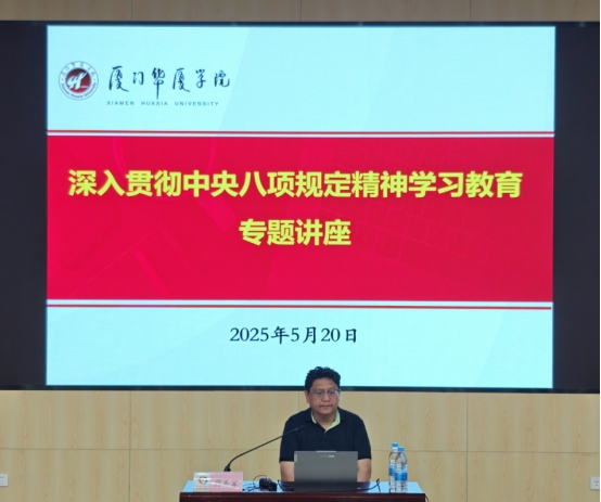 2025年5月20日下午,厦门华厦学院深入贯彻中央八项规定精神学习教育读书班专题辅导报告会在明德报告厅举行。邀请华侨大学科研院院长,哲学与社会发展学院教授、博士生导师薛秀军作题为《 锲而不舍贯彻中央八项规定精神》专题辅导讲座。校党委委员,校党委理论学习中心组成员,中层干部,年轻干部及师生党员参加学习。讲座由党校副校长周云岗主持。