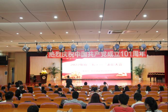 为庆祝中国共产党成立101周年,迎接党的二十大的胜利召开,7月8日,校党委在俊秀厅举行2022年度“七一”表彰大会,会议由校党委副书记陈熙贞主持,校党委委员、各总支书记和全体党员参加了大会。