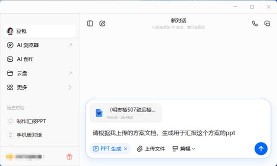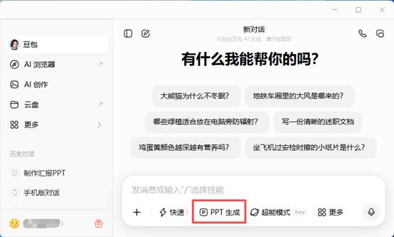 二、 打开豆包,点击界面上的PPT生成按钮,如下图: