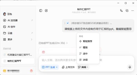 三、 输入你要生成 PPT 的主题、具体要求,信息越详细,生成的 PPT 越精准;如果有相关文件(如项目建设方案 Word 文档),可直接上传文件,快速生成对应 PPT。